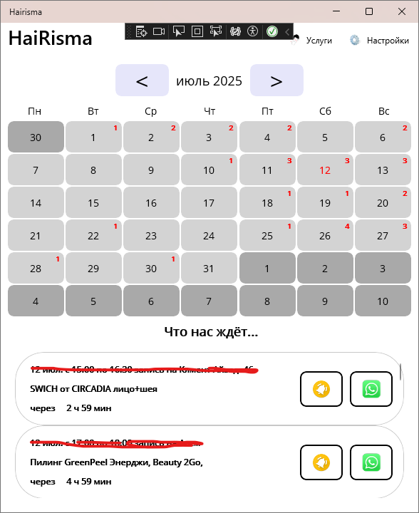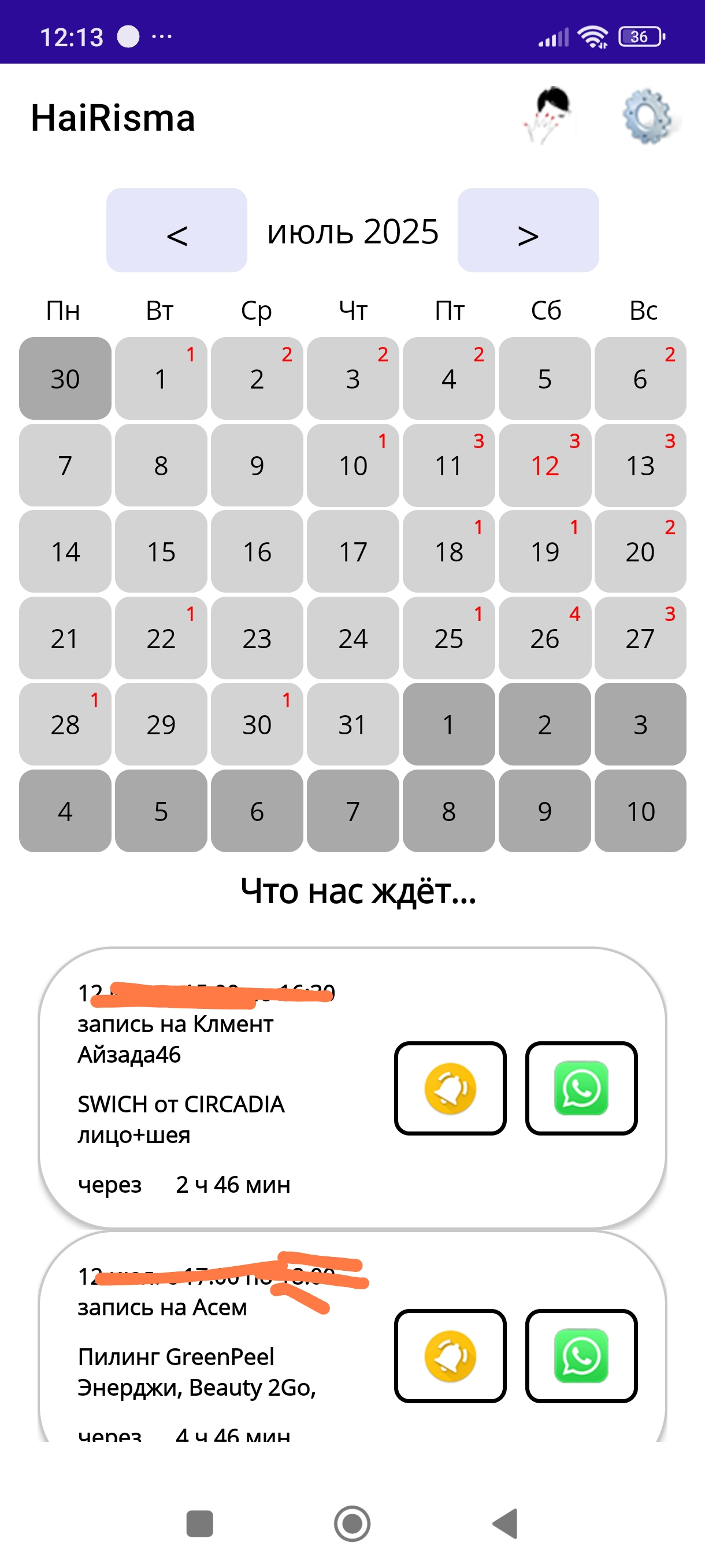 В общем на главном экране нас встречает каледарь на котором отмечены даты и количество заказов в этот день, а ниже список всех будущих заказов, с возможностью отправки напоминания клиенту.