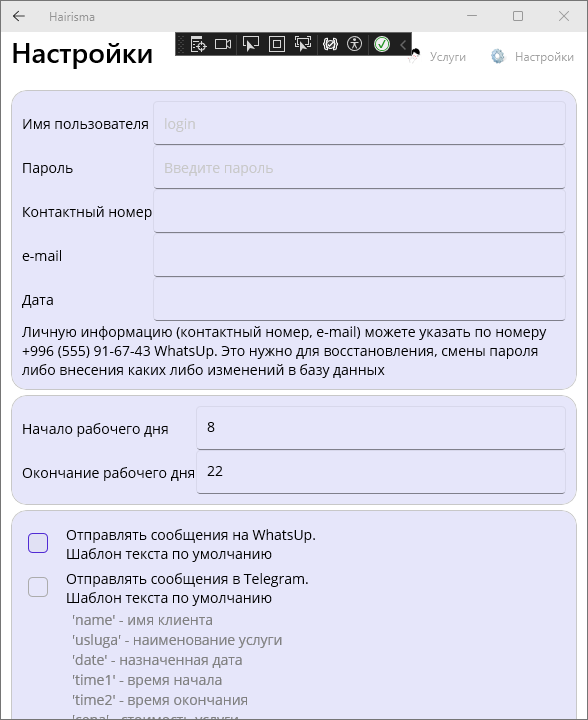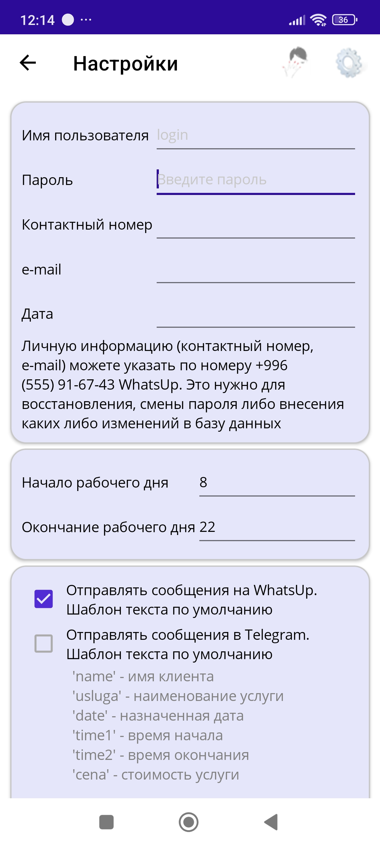 Далее по желанию указать часы работы, отправлять ли автомтически сообщения WhatsUp при создании записи, создать / отредактировать текст сообщения по умолчанию, ну и так далее - работа ещё не завершена.