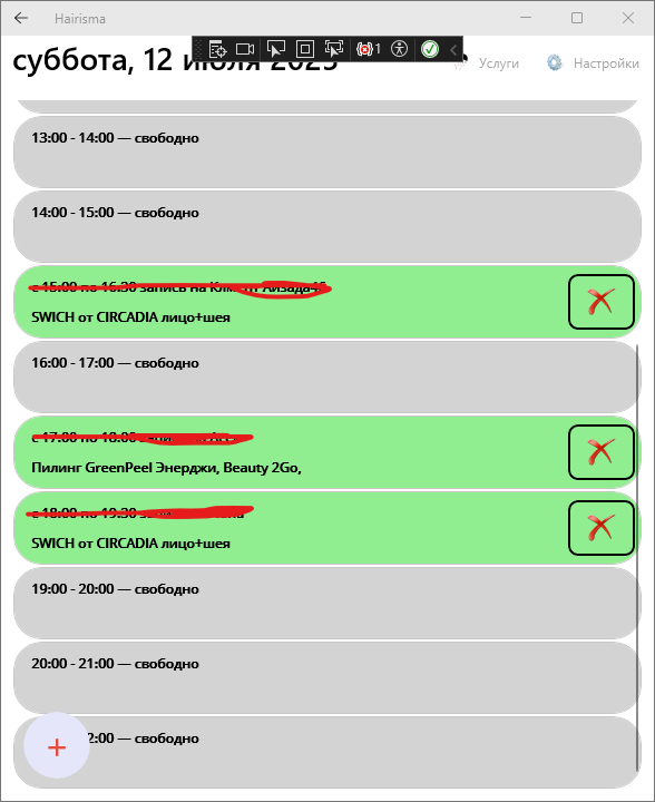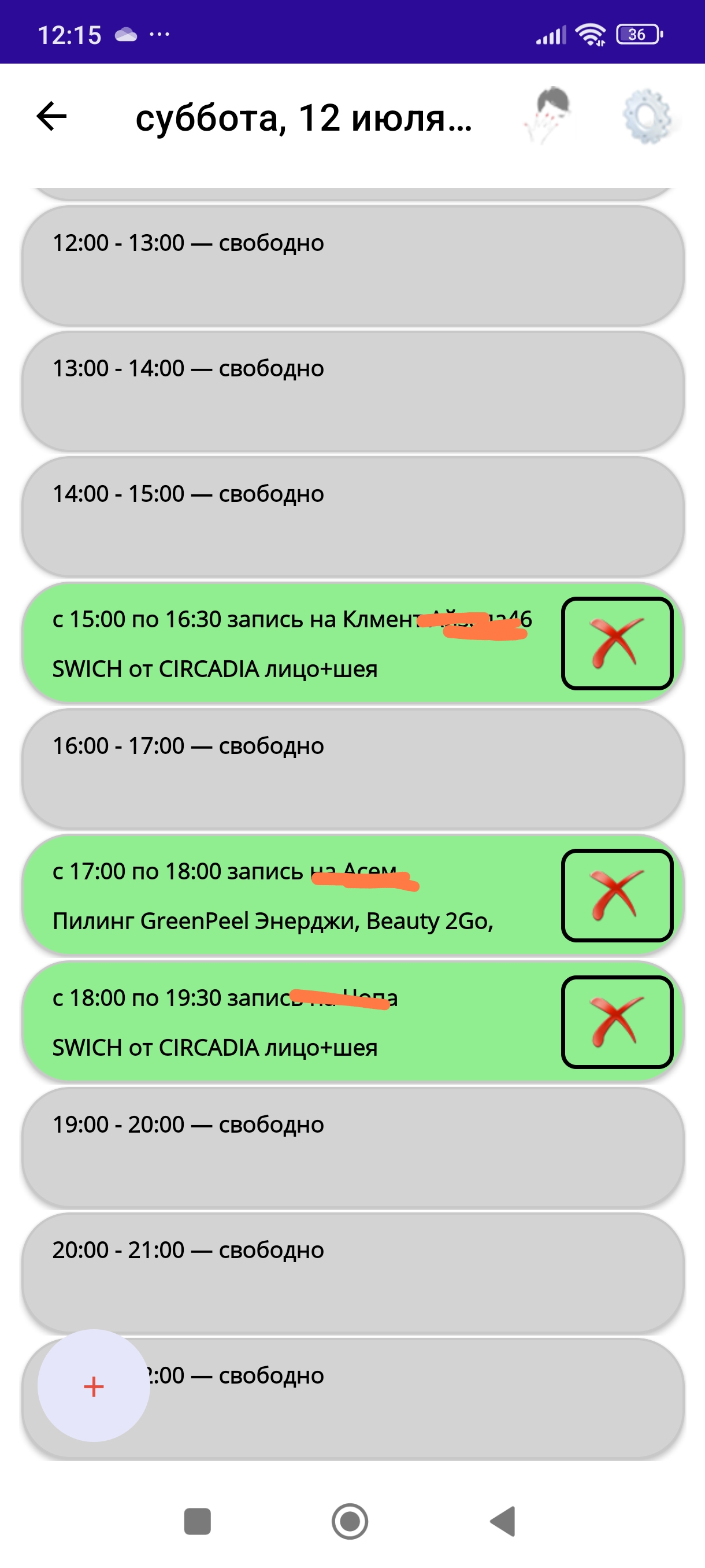 После этого на главной странице нажимаете на число и видите на какое время у Вас записи, когда есть свободный отрезок. Тут нажав на временной отрезок редактируете / добавляете заказы.