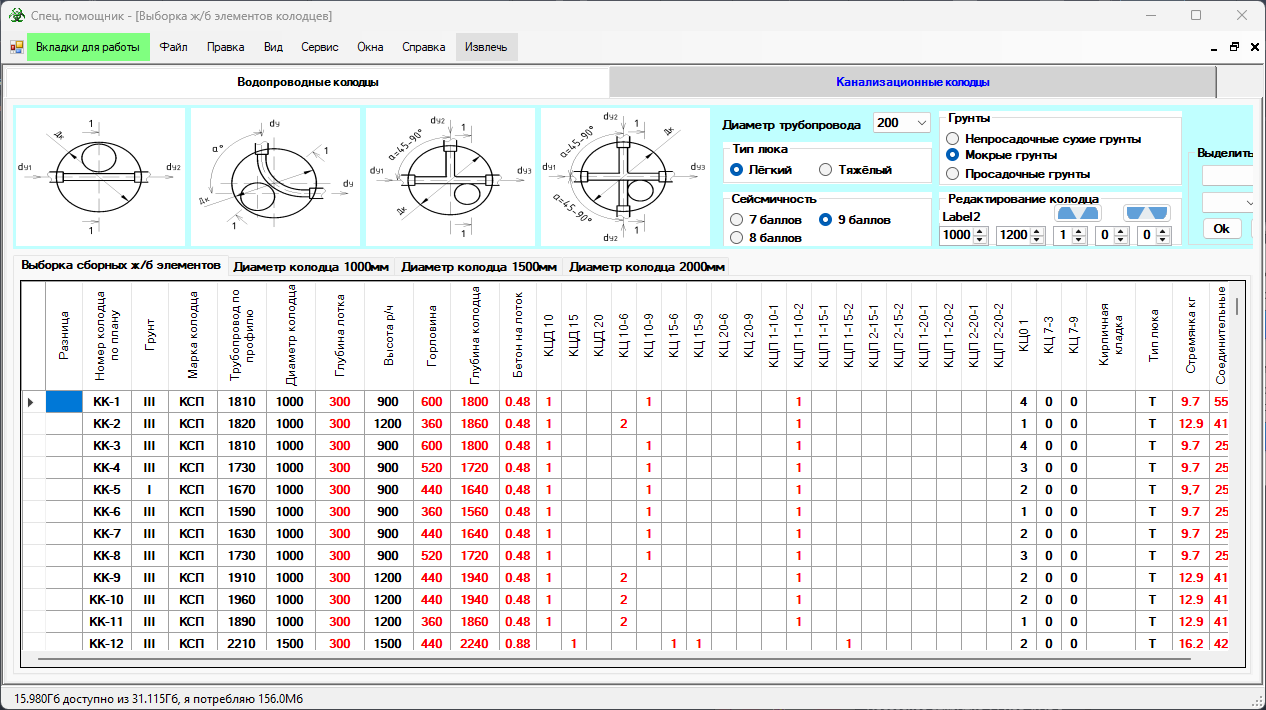 По сути программу писал исходя из таблиц типового проекта 902-09-22.84, выбираете рабочую часть и диаметр, а по ним вводятся все составные элементы и рассчитывается полная глубина колодца, стремянка и соединительные элементы. Левый крайний столбец указывает разницу между полученной глубиной колодцев и глубиной заложения трубопровода. Но так как у нас таких диаметров нет, когда два подводящих коллектора диаметром 200мм на выходе дают 300мм, поэтому узлы из типового альбома не подходят.