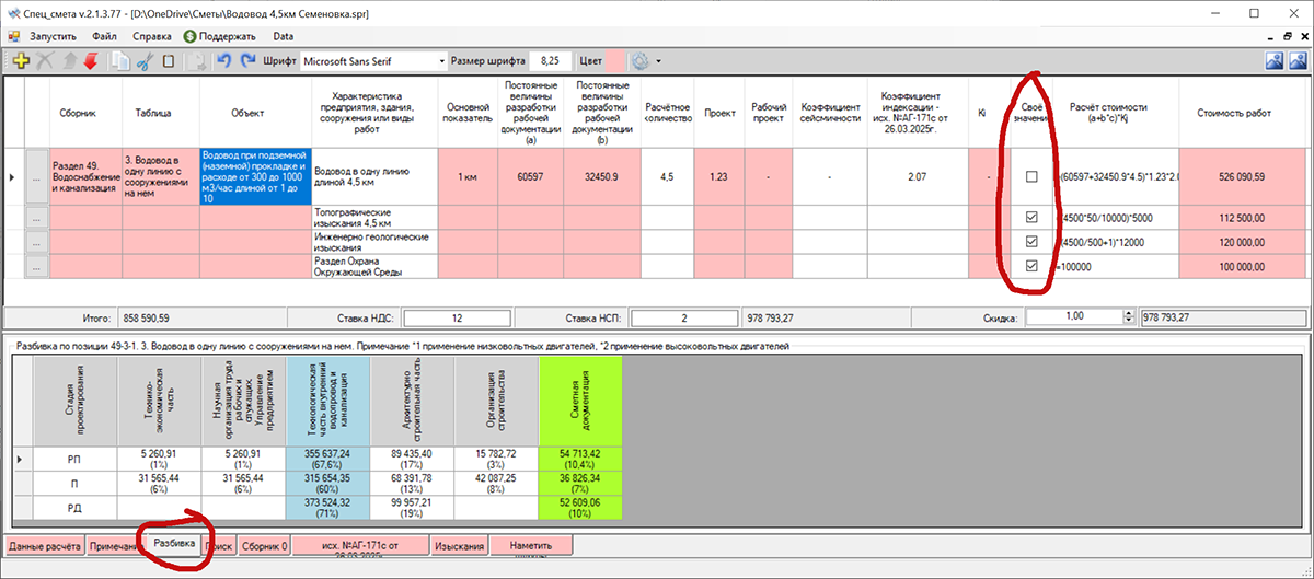 Ну во Вы нажали кнопку применить и получили первые данные. Как только Вы активируете вкладку разбивка то при перемещении по табличнм данным будет показана разбтивка по разделам проекта в процентах и в ценах без применения НДС и НСП.