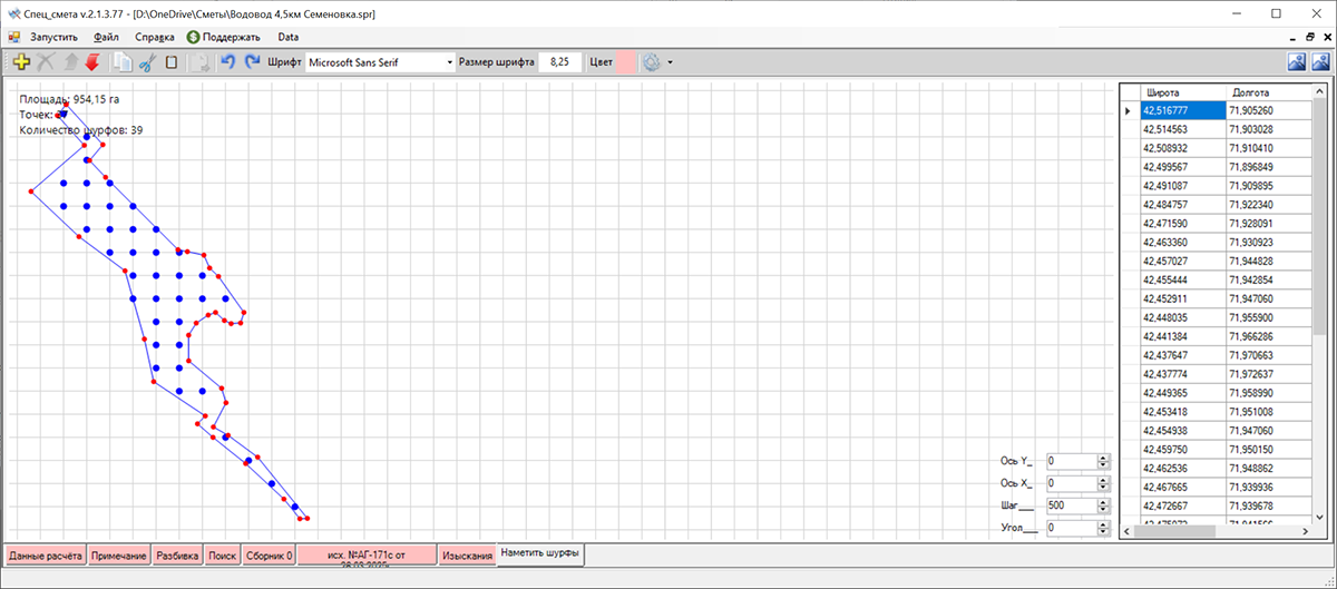 Наметить шурфы - при оценке как правило есть местоположение объекта и некая информация вот я и подумал, а что если выгрузить KML файл района строительства и считать эти данные. В результате я могу вычертить контур и посчтать площадь, да это можно сделать в той же программе от куда и получен этот контур, но я рисую сетку которую можно вращать и двигать и смотреть как располагаются точки внутри - некоторая схема шурфов для изысканий - их количество так же будет посчитано и выведено в информацию, останется только визуально добавить или вычесть на усмотрение автора.