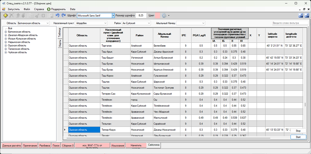 Дело в том что при подсчте проектной стоимости работ необходимо знать сейсмичность района, но от куда её взять? И тут на глаза мне попался СН КР 20-02:2024* "Сейсмостойкое строительство. Нормы проектирования" где в приложении Г расписаны населенный пункты в формате: Населённый пункт --> Район --> Айыльный Кенеш и интенсивность сейсмического сотрясения в баллах.